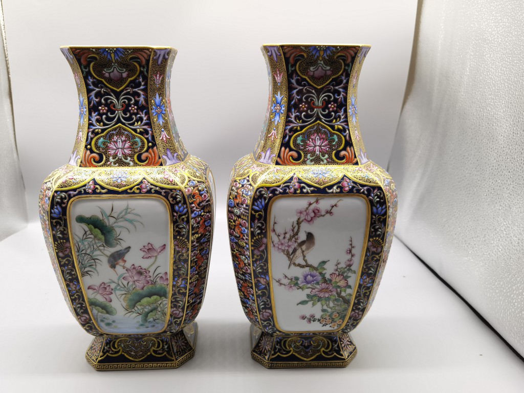 (清乾隆) 磁胎洋彩青地金花魚遊轉心瓶